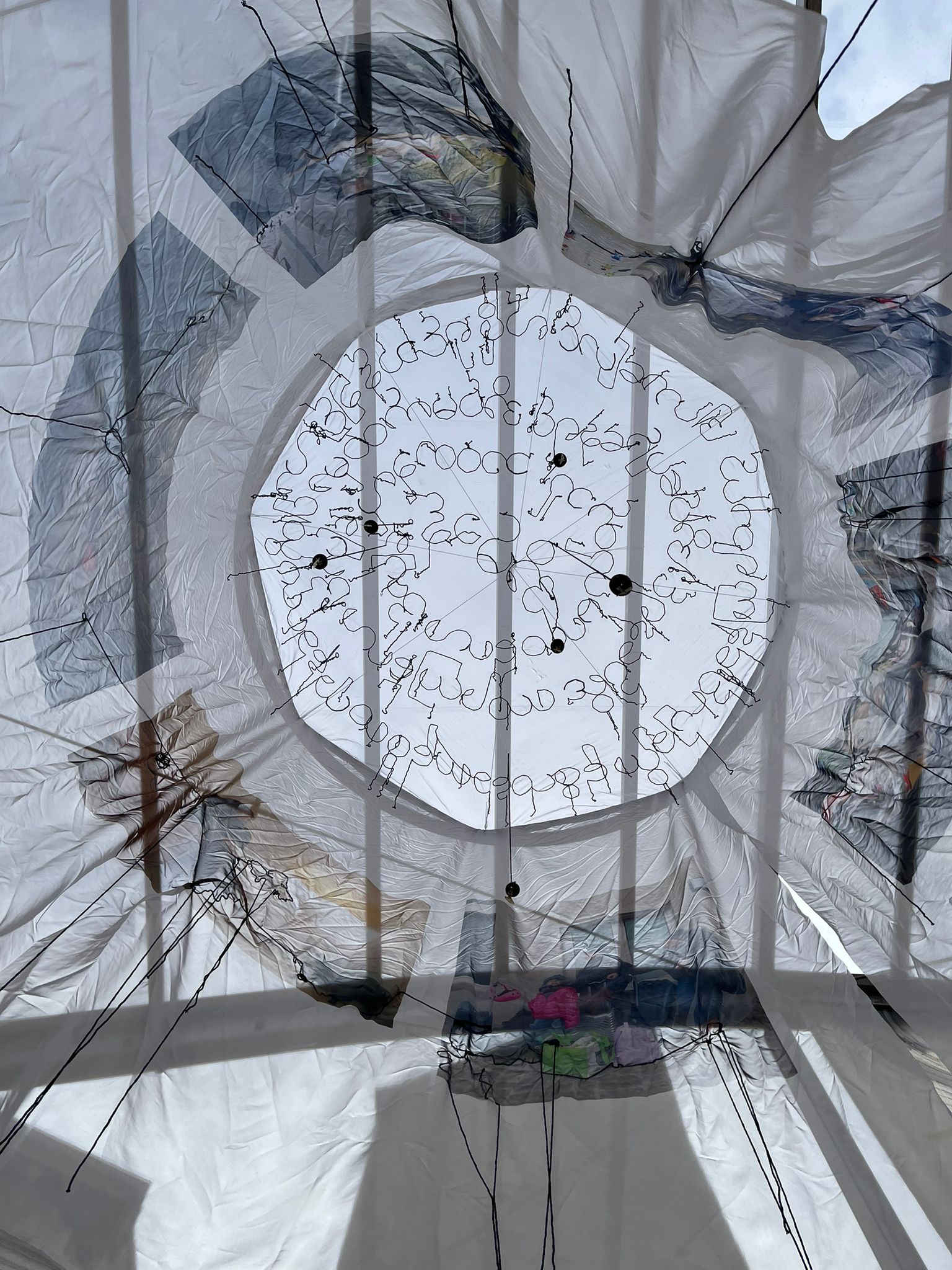 Home #2 is a large circular installation made of transparent chiffon, suspended like a delicate shelter. it is inspired by the mosquito net, a common household object in Myanmar and Southeast Asia- both a practical tool and a symbol of safety , intimacy and belonging.